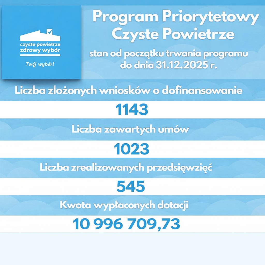 Od początku trwania programu Czyste Powietrze do dnia 31.12.2025r. Gmina Wieluń złożyła 1143 wnioski o dofinansowanie, liczba zawartych umów 1023, liczba zrealizowanych przedsięwzięć 545, kwota wypłaconych dotacji 10 996 709,73 zł.
